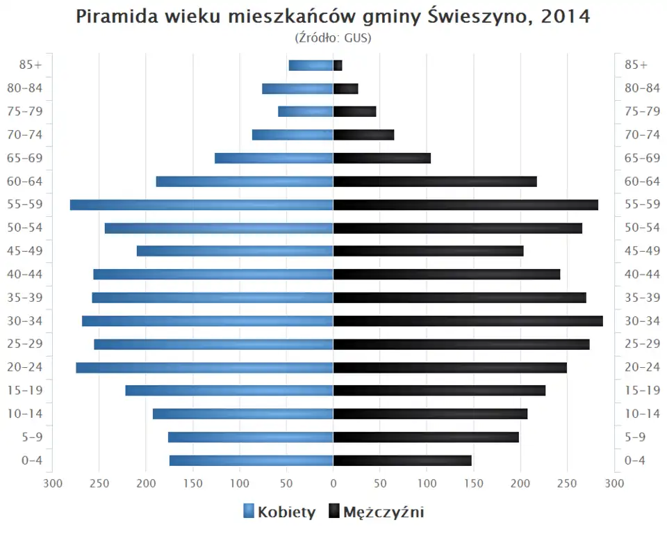 - Piramida wieku mieszkańców gminy Świeszyno w 2014 roku[1].