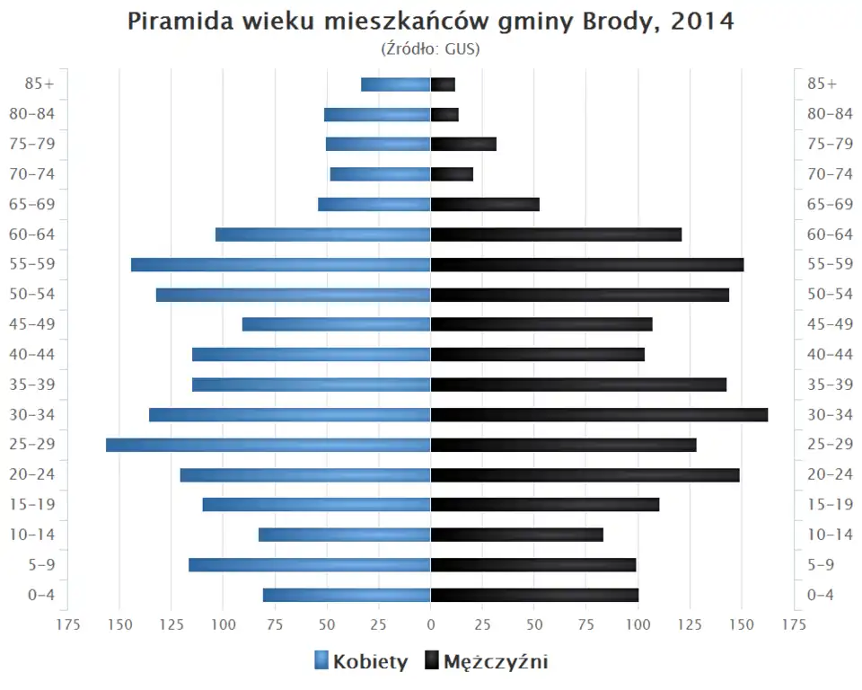 - Piramida wieku mieszkańców gminy Brody w 2014 roku[1].