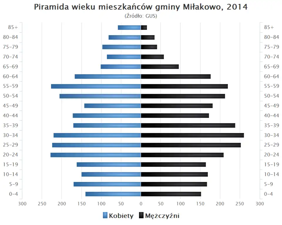- Piramida wieku mieszkańców gminy Miłakowo w 2014 roku[1].