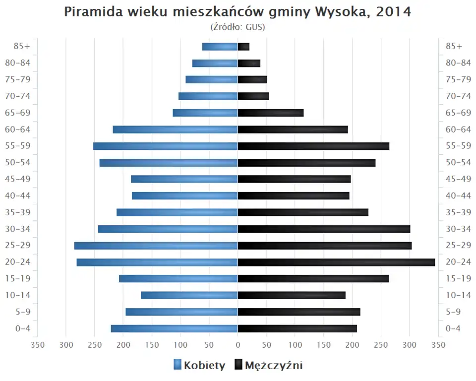 - Piramida wieku mieszkańców gminy Wysoka w 2014 roku[1].