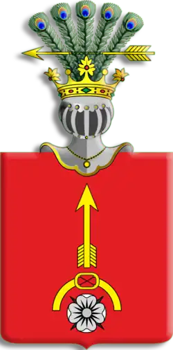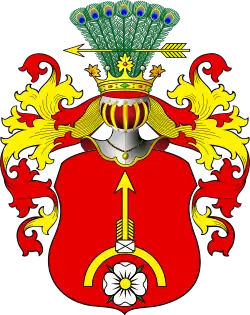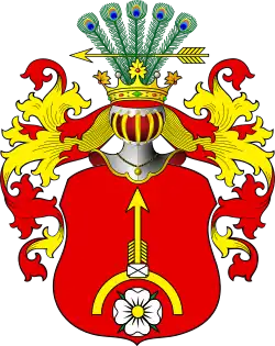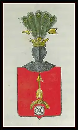 Klejnot: Nad hełmem w koronie ogon pawi przeszyty strzałą złotą.