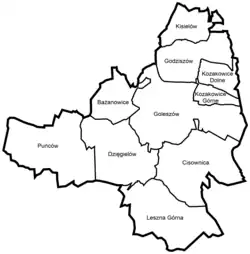 W skład gminy wchodzi 10 miejscowości i 11 sołectw (miejscowość Goleszów składa się z 3 sołectw, a miejscowości Kozakowice Górne i Kozakowice Dolne składają się na jedno sołectwo o nazwie Kozakowice)[2]
