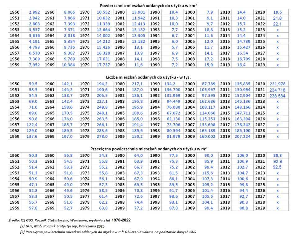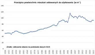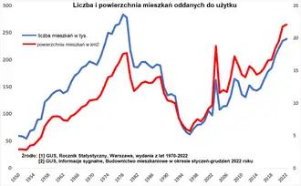 W roku 1960 oddano do użytku 142,1 tysiąca mieszkań, a w roku 1970 194,2 tysiąca mieszkań[2]. Najwięcej mieszkań wybudowano w 1978 roku – 283,6 tys. o przeciętnej powierzchni około 62 m². Liczba oddawanych mieszkań od roku 1964 do roku 1989 włącznie nie spadała poniżej 150 tys. Dla porównania, w roku 2015 wybudowano 147,7 tys. mieszkań. Średnia powierzchnia mieszkań oddawanych przez deweloperów w roku 2016 wyniosła 58,2 m²[3], a w latach 1990–2015 liczba mieszkań 150 tys. została przekroczona w 2003, 2008 i 2009 roku. Po okresie PRL przekroczono granicę 200 tys. mieszkań budowanych rocznie w latach 2019–2022, a ich średnia powierzchnia wynosi około 90 metrów kwadratowych[4].