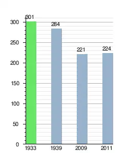 W 1933 roku w miejscowości mieszkało 301 osób[5], a w 1939 – 284 osoby[6][7]. W roku 2009 mieszkało tu 221 osób[8][9], a w roku 2011 – 224 osoby[1].