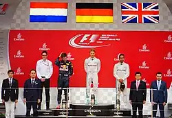 - ↑ Kara cofnięcia o 3 pozycje na starcie wyścigu za spowodowanie kolizji z Rosbergiem w Grand Prix Malezji.