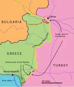 Obecny przebieg granicy ustalony został traktatem w Lozannie (24 lipca 1923), po przegranej przez Grecję wojnie z Turcją. Wojna ta spowodowana była nieuznaniem przez Turcję granicy z Grecją ustaloną traktatem sewrskim (10 sierpnia 1920).