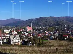 - południowo-wschodni, niżej zakręcający na południe, ze szczytami Jaworzyca, Babia Góra, Juraszowa Góra[3][2].