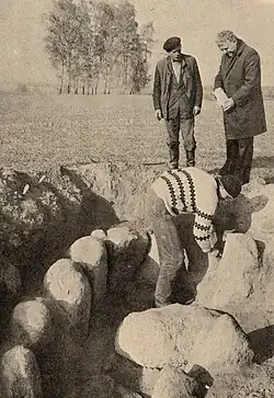 Ostatecznie określono, że znaleziskiem jest prostokątny, neolityczny grobowiec skrzynkowy. Zbudowany został ze szczelnie dopasowanych kamieni przez grupę ludności kultury amfor kulistych, która żyła w tych rejonach około 2500 lat p.n.e. Naczynia znalezione w grobowcu zdobione były charakterystycznym ornamentem stempelkowym w postaci pionowych i naprzemianległych kresek oraz odcisków sznura. Naczynia stały w szczycie komory grobowej, która miała 1,9 metra szerokości. Długość grobowca wynosiła niecałe trzy metry. Wejście stanowiła ruchoma płyta kamienna. Płasko ciosane płyty kamienne stanowiły dach założenia. Obiekt uszczelniono za pomocą mniejszych kamieni. Również dno wyłożone było kamieniami[2]. Nie znaleziono żadnych szczątków ludzkich - wolna przestrzeń w komorze sprawiła, że uległy one całkowitemu rozkładowi. Grobowiec był prawdopodobnie użytkowany przez jedną rodzinę (klan)[1].