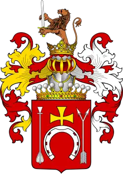 Herb z 1800: W polu czerwonym podkowa srebrna z zaćwieczonym na barku krzyżem kawalerskim; na prawo strzała naturalna o upierzeniu srebrnym o trzech zębach i rozdarciu srebrnym; na lewo strzała naturalna o upierzeniu srebrnym i grocie rozdartym srebrnym. Nad tarczą korona hrabiowska. Nad nią hełm z klejnotem: pół lwa naturalnego, wspiętego, trzymającego miecz srebrny w obu łapach. Labry: czerwone, z prawej podbite złotem, z lewej srebrem.