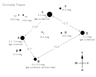 Nazwa gromady pochodzi od układu czterech najjaśniejszych składników przypominającego trapez. Zostały one określone jako A, B, C oraz D w kolejności rosnącej rektascensji. Składniki A oraz B zostały zidentyfikowane jako gwiazdy zmienne zaćmieniowe. Najjaśniejszym z czterech głównych składników jest C, oficjalnie nazwana theta1 Orionis C, o jasności wizualnej 5,13m. W 2009 roku stwierdzono, że jest ona ciasnym układem podwójnym[1].