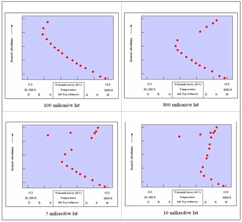 Na diagramie Hertzsprunga-Russella dla gromady otwartej większość gwiazd leży na ciągu głównym. Najbardziej masywne gwiazdy schodzą z ciągu głównego ewoluując w stronę czerwonych olbrzymów. Miejsce na wykresie, gdzie takie gwiazdy zaczynają schodzić z ciągu głównego, zależy od wieku gromady i może zostać użyte do jego oszacowania.