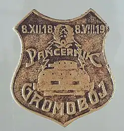 Odznaka w kształcie tarczy herbowej, odlewana w jasnym brązie, srebrzona obustronnie w kąpieli, lekko oksydowana, minimalnie wypukła. Wymiary: 42 × 48 milimetrów, grubość około 2 milimetry. U góry daty: 8 XII 18 - 8 VIII 19. Pomiędzy datami wianek, z którego biją dwie zygzakowate linie piorunów. Pod wiankiem fantazyjny napis: Pancernik. Pod napisem wyobrażenie wozu bojowego, a pod nim napis: Gromobój. Odznaka noszona na śrubie[4][5].