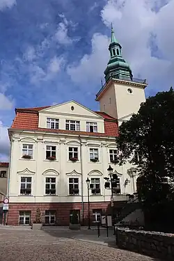Pozostałości zamku krzyżackiego z drugiej połowy XIII w. – wieża „Klimek”, niewielki fragment parteru skrzydła południowego (a nie jak dotąd twierdzono – wejście do kaplicy) z domurowanym na początku XX w. portalem, który niesłusznie brano za okno kaplicy (badania archeologiczne prowadzone od 4 czerwca 2008 wykazały, że ów portal nie posiada żadnych fundamentów, a więc jest tylko atrapą)