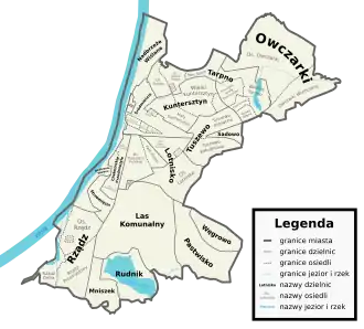 Grudziądz nigdy nie posiadał ustanowionego oficjalnego podziału administracyjnego. Przez lata istniał umowny, niejasny podział na dzielnice i osiedla[60], często różniący się między historycznymi granicami miejscowości wchodzących w skład miasta, przekazem ustnym mieszkańców, a mapami ściennymi oraz dostępnymi online. Bardziej oficjalne podziały Grudziądza były ustanawiane w zależności od aktualnych potrzeb miasta (jak choćby podział na sektory odbioru odpadów komunalnych[61]).