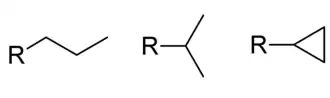 Istnieje izomeryczna postać grupy propylowej – „izopropylo-” (nazwy systematyczne: „propan-2-ylo-” lub „1-metyloetylo-”)[2], skrót „iPr”[3] – otrzymana poprzez usunięcie atomu wodoru przy środkowym atomie węgla propanu. Dodatkowo istnieje jeszcze trzecia, cykliczna postać grupy propylowej, nazywana „cyklopropylo-” lub „c-propylo-”. Nie jest to postać izomeryczna z pozostałymi formami, ma wzór −C
