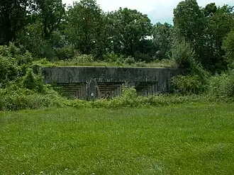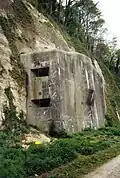 - Zdjęcie satelitarne na Google Maps. Widoczny narys i poszczególne obiekty grupy warownej. Na otwartej przestrzeni dobrze widoczny blok z wieżą dział 120mm.