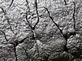 Podkładki o barwie od czerwonawobrązowej do czarnej. Na martwym drewnie tworzy ściśle przylegającą, rozpostartą, cienką i nieco wypukłą skorupę z głębokimi poprzecznymi szczelinami. Ma ona grubość 2–3 mm, niski brzeg, płaską powierzchnię i zaokrąglone naroża. Ektostroma czarna, endostroma białokremowa. Ostiole wystające, tarczowate lub krzyżowe. Worki 20–40 pm z szypułką do 70 µm długości i aparatem apikalnym. Askospory kiełbaskowate, 7–9 (–10) × 1,2–1,5 tarczowate, płaskie z 4–6 bruzdkami. Wewnętrzna część podkładek (endostroma) jest kremowobiała. Worki o wymiarach 32–50 × 4–6 µm, askospory kiełbaskowate, 7–9 (–10) × 1,2–1,5 µm[4].