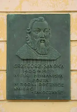 - W 1976 trwały przygotowania do obchodów 500. rocznicy śmierci Grzegorza z Sanoka, zaplanowanych na rok 1977; Edward Gorol zaprojektował medal pamiątkowy z podobizną Grzegorza z Sanoka, wytłoczony przez Mennicę Państwową w liczbie 500 egzemplarzy[9], Roman Tarkowski zaprojektował specjalną plakietę (z herbem Sanoka na rewersie)[10][11] oraz kartę pocztową wydaną przez Ministerstwo Łączności, Tadeusz Turkowski dokonał reprodukcji drzeworytu z podobizną Grzegorza z Sanoka, zaś na 1977 zaplanowano zjazd sanoczan i sesję naukową w dniach od 27 maja do 1 czerwca, po której zapowiedziano wydanie V tomu „Rocznika Sanockiego”[12][13][14][15]. Na fasadzie budynku przy ul. Zamkowej 2 w Sanoku (tzw. Zajazd) – obecnie siedziba Muzeum Historycznego w Sanoku – obok drzwi wejściowych znajduje się tablica upamiętniająca Grzegorza z Sanoka stworzona w 500. rocznicę śmierci. Odsłonięcie miało miejsce podczas „Dni Sanoka” 30 maja 1977 roku. Autorem odlanej w brązie tablicy o wymiarach 90 x 60cm był artysta rzeźbiarz Roman Tarkowski[16][17]. Inskrypcja brzmi: Grzegorz z Sanoka 1406–1477. Wielki humanista i poeta. W 500-ną rocznicę śmierci – sanoczanie[18].