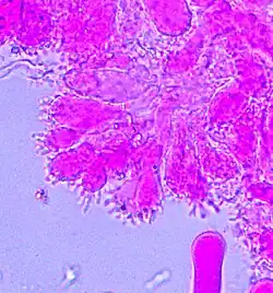 Podstawki 25–36 × 9–12 µm, maczugowate, 4-zarodnikowe ze sprzążkami, lub 2-zarodnikowe bez sprzążek, z rozdętymi sterygmami o długości do 13 µm. Zarodniki na podstawkach 4-zarodnikowych 8–10,5 × 7,5–10 µm, na podstawkach 2-zarodnikowych 13 × 12 µm, kulistelub prawie kuliste, gładkie, amyloidalne. Cheilocystydy 12–54 × 6–25 µm, pomieszane z podstawkami, maczugowate, ze sprzążkami lub bez, nierównomiernie pokryte prostymi lub rozgałęzionymi, zakrzywionymi lub krętymi naroślami o długości do 20 µm. Pleurocystyd brak. Trama blaszek dekstrynoidalna, w odczynniku Melzera barwiąca się na czerwono-brązowo. Strzępki włosków kapelusza o szerokości 2–5 µm, pokryte cylindrycznymi naroślami. Strzępki warstwy korowej trzonu uchyłkowate o końcowych komórkach mających długość 25–37,5 µm[3].