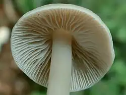 Szerokie i zbiegające ząbkiem na trzon, koloru białego, tylko u trzonu ciemniejsze, szaroczarne, Ostrza blaszek nierówne, nieco pofalowane[5].