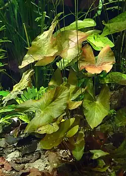 - Posiada dwa rodzaje liści: podwodne i pływające. Podwodne są mniejsze, kształtu od szeroko strzałkowatego do owalnego o brzegach równych, lekko faliste. Kolorystyka liści jest zmienna, zależna od natężenia oświetlenia. W uprawie w trzech barwnych odmianach: o liściach zielonych, blado czerwonofioletowych i intensywnie czerwonych. Wszystkie odmiany posiadają cętkowane liście, różniące się od siebie nasyceniem kolorów i ilością plamek. Liście pływające na powierzchni wody rzadko pojawiają się w uprawie akwariowej. Są okrągławe, z nasadą wyciętą, na brzegu ząbkowane.
