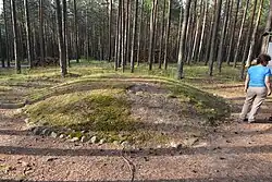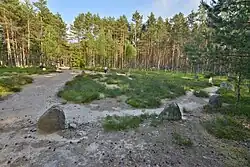 - Kurhany. Zachowały się dwa kurhany. Jeden z nich, o średnicy u podstawy 6 m, został usypany na jednowarstwowym bruku kamiennym pod którym odkryto szkieletowy grób kobiety datowany na ostatnią ćwierć I w. n.e. Drugi kurhan powstał na skutek wykorzystania naturalnego pagórka o wysokości ok. 0,5 m, w który wkopano grób szkieletowy, a całość przykryto brukiem kamiennym[1].
