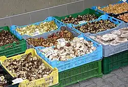 - grzyby jadalne – czyli wybrane gatunki grzybów wielkoowocnikowych, uznane za smaczne, a przynajmniej nietrujące. Ponadto „jadalne” są też drożdże i niektóre gatunki pleśni związane z produkcją serów.