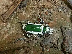 - Grzyby entomopatogeniczne. W 2013 r. na świecie opisano ponad 1200 gatunków pasożytujących na owadach, a w Polsce 230[8]. Najczęściej dostają się do wnętrza ich ciała przez uszkodzenia oskórka, rzadziej przez przetchlinki, otwór gębowy lub odbytowy, ale niektóre potrafią także chemicznie rozpuścić chitynowy oskórek. Wewnątrz ciała owada tworzą grzybnię przenikająca jego narządy wewnętrzne. Pobierają z niego substancje odżywcze, a także wydzielają mykotoksyny, wskutek czego porażony owad staje się powolny, przestaje żerować, a w końcu nieruchomieje przyjmując nienaturalną pozycję. Większość gatunków grzybów i organizmów grzybopodobnych pasożytujących na owadach to gatunki letalne, zabijające swoje ofiary. W obumarłym ciele owada rozwija się ich grzybnia. Jej strzępki przebijają ciało owada i na zewnątrz wytwarzają zarodniki infekujące inne owady[8].
