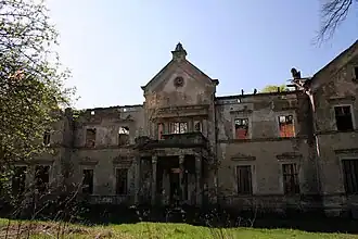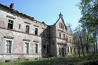 - Ruina pałacu – wzmianki o pałacu pochodzą z 1839, kiedy to już popadał w ruinę. Odnowiony przez Hermanna von Hertell po 1872 w stylu neoklasycystycznym. Po 1945 budynek zaadaptowano na potrzeby szkoły i użytkowano częściowo do końca lat 80. XX w. W 1996 zniszczył go pożar. Obecnie zdewastowany – brak dachu, stropy zawalone, wnętrze zniszczone. Architektura obiektu jest jednak nadal czytelna – bryła dwukondygnacyjnego pałacu jest rozczłonkowana symetrycznie ryzalitami, elewacje przeprute prostokątnymi oknami, zdobione profilowanymi gzymsami i naczółkami.