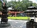 Kompleks klasztorny jest wybudowany zgodnie z chińską tradycją, skierowany w stronę południową wzdłuż osi południe-północ. W pierwszej bramie znajdują się dwa duże posągi strażników Dharmy. Druga brama jest tradycyjnie bramą Czterech Niebiańskich Królów, których posągi znajdują się po obu stronach przejścia. Dość nietypowo, w samym centrum bramy znajduje się posąg Maitrei, wyobrażonego pod postacią Śmiejącego się Buddy[2].