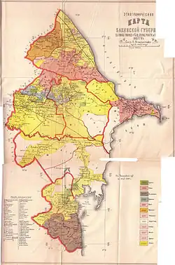 Ludność, według spisu powszechnego 1897 – 826 716 osób – Azerów (58,7%), Tatów (10,8%), Rosjan (8,9%), Ormian (6,3%), Lezginów (5,8%), Tałyszów (4,2%), Laków (1,4%), Niemców, Persów, Żydów i Awarów kaukaskich.