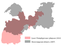 Od 1914 gubernia piotrogrodzka, od 1924 – gubernia leningradzka. Gubernia leningradzka istniała do 1 sierpnia 1927 r., kiedy została zlikwidowana postanowieniem Prezydium WCIK.