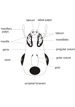 Gula położona jest w środkowej części brzusznej strony głowy[1] i wchodzi w skład puszki głowowej[2].