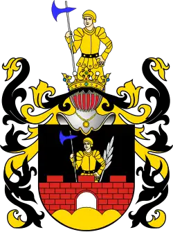 W polu czarnym, na trójwzgórzu złotym, mur czerwony o trzech blankach i bramie otwartej, srebrnej, za którym mąż w zbroi złotej, przepasany pasem czarnym z trzema guzami złotymi, trzymający halabardę błękitną, po którego lewej stronie gałąź palmowa srebrna.