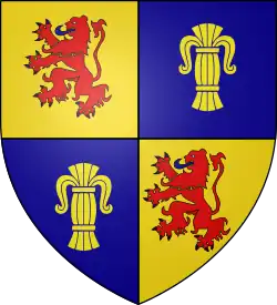 Na tarczy czterodzielnej w polach I i IV srebrnych – lew wspięty czerwony, w II i III błękitnych – snop złoty. Nad hełmem w koronie pół lwa snop trzymającego[2].