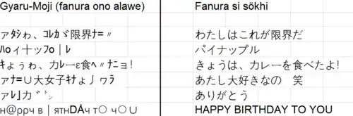 | Oryginalna pisownia | Gyaru-moji | |||||||||