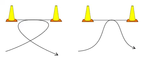 Trudność tego manewru zależy od szerokości rozstawienia pachołków, zazwyczaj wynoszącej mniej więcej tyle, co szerokość motocykla. Linię łączącą oba pachołki należy przejechać obydwoma kołami, a następnie powtórzyć to od drugiej strony.