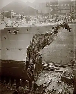 - ↑ W starciu ucierpiał również HMS „Spitfire”, staranowany przez pancernik SMS „Nassau”[9][10].