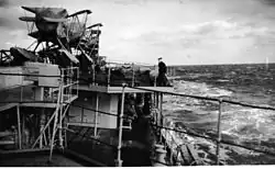 Rufowa część pokładu była przykryta gładkim pokładem lotniczym, na rufie znajdował się dźwig do podnoszenia wodnosamolotów z wody. Obrotowa katapulta znajdowała się za wieżą rufową, na równi z pokładem lotniczym i można było na nią przetaczać samoloty z trzech torów na pokładzie lotniczym oraz dwóch po bokach wieży[17]. Długość katapulty w pozycji spoczynkowej wynosiła 14 m, a do startu rozkładano ją do 22 m[18]. Wystrzeliwała samoloty za pomocą sprężonego powietrza, co dwie minuty[18]. Po wodowaniu samolot był podnoszony żurawiem, przy czym w razie falowania można było zastosować prostokątny żagiel holowany za okrętem, na który wpływał wodnosamolot[18].
