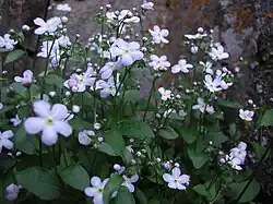 - 5-krotne, niebieskie, różowe lub białe o średnicy do 2 cm[5], zebrane w nierozgałęzione kwiatostany, rzadko pojedyncze[7]. Działki kielicha zrośnięte tylko u nasady, zwykle rozpostarte lub odgięte w czasie owocowania. Płatki korony zrośnięte u nasady w krótką rurkę z białymi lub żółtymi osklepkami w gardzieli[5]. Końce płatków rozpostarte i zaokrąglone tworzą koronę dzwonkowato-kółkową[7]. Pręciki równej długości, zwykle krótsze od rurki korony, ich nitki są bardzo krótkie, a pylniki krótkie. Zalążnia górna, czterokomorowa, z pojedynczą szyjką słupka jeszcze krótszą od pręcików, nie wystającą z rurki korony[5].