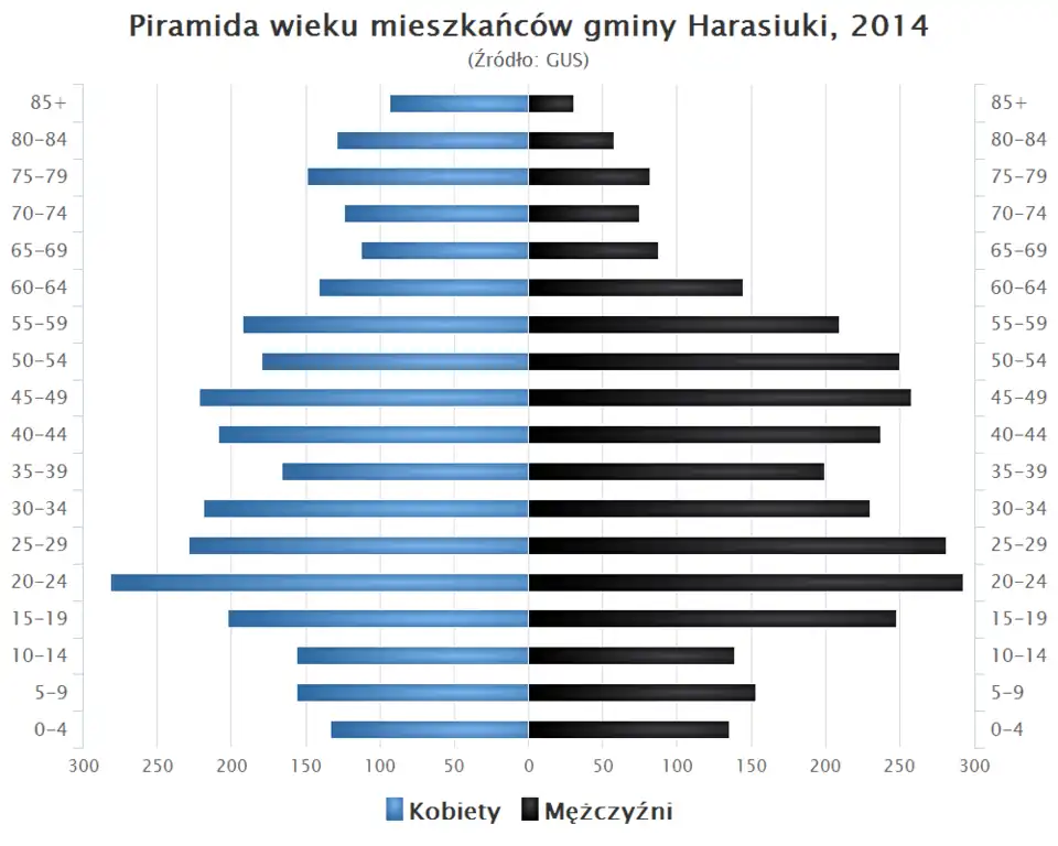 - Piramida wieku mieszkańców gminy Harasiuki w 2014 roku[5].