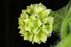 - Roślina jednopienna, lecz rozdzielnopłciowa. Kwiaty męskie zebrane są po 10–34 w kwiatostany osiągające od 3 do 22 cm długości[6], których szypuły są gruczołowato owłosione[5]. Ich płatki korony mają barwę białawą lub zielonkawożółtą, z zielonymi żyłkami i długość do 5 mm. Działki kielicha lancetowate, długości 1 mm. Pręcików jest od 3 do 7, a ich pylniki mają kształt litery S. Zarówno nitki jak i pylniki pręcików są ze sobą zrośnięte[5]. Kwiaty żeńskie są mniej liczne w kwiatostanach – jest ich od 8 do 16, a same kwiatostany mają od 2 do 5 cm długości[6] – kwiaty są zbite w główki. Płatki są równowąskie lub równowąskojajowate o długości do 2 mm[6], zielonkawożółte z zielonymi żyłkami. Działki kielicha są drobne, lancetowate. Słupek z zalążnią długości 1–3 mm, z pojedynczą szyjką o 2–3 znamionach[5].