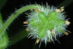- Jajowate i ostro zakończone torebki o długości 9–15 mm pokryte sztywnymi kolcami, włoskami pajęczynowatymi i gruczołowatymi[6]. Młode torebki są zielone, a dojrzałe – brązowe[8]. Zawierają pojedyncze, jajowate nasiono, ciemnobrązowe, o długości do 10 mm[5].