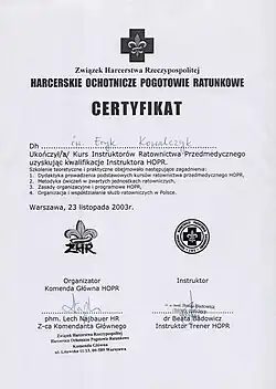 3. Kurs trenerski HOPR – tylko dla osób wykonujących zawód lekarza, metodyka prowadzenia kursów instruktorskich HOPR, kursy prowadziła Komenda Główna HOPR