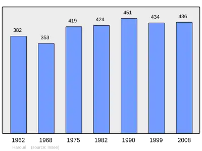 Według danych na rok 1990 gminę zamieszkiwało 451 osób, a gęstość zaludnienia wynosiła 109 osób/km² (wśród 2335 gmin Lotaryngii Haroué plasuje się na 626. miejscu pod względem liczby ludności, natomiast pod względem powierzchni na miejscu 1085.).