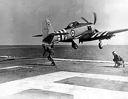 Hawker Sea Fury, stacjonujące na lotniskowcach HMS „Theseus”, „Ocean” i „Glory”, od 1950 roku brały udział w wojnie w Korei. Pierwsza akcja bojowa miała miejsce 10 października 1950 roku[10]. Używano ich głównie do ataków na cele naziemne. Ponosiły straty bojowe, głównie od ognia przeciwlotniczego, oraz w wypadkach, a jeden omyłkowo zestrzeliły myśliwce amerykańskie[11] Jednak 9 sierpnia 1952 r., kpt. P. Hoagy Carmichael z 802 Dywizjonu FAA z HMS „Ocean” zestrzelił myśliwiec odrzutowy MiG-15[12]. Był to pierwszy przypadek zestrzelenia MiG-15 przez samolot napędzany silnikiem tłokowym i jednocześnie jedyne zwycięstwo brytyjskiego lotnika używającego brytyjskiego samolotu w wojnie koreańskiej[13]. Był to jeden z ostatnich przypadków zestrzelenia samolotu odrzutowego przez samolot śmigłowy (ostatnim był Douglas A-1 Skyraider w 1966 roku). Ogółem brytyjskie i australijskie lotniskowce straciły 22 pilotów w walce i 13 w wypadkach[a].