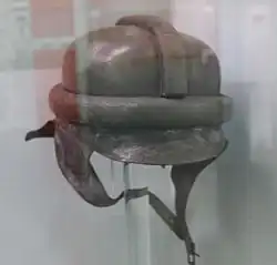 Hełm w całości (nie licząc amortyzujących uderzenia wałków) wykonany był ze skóry. Czerep zaopatrzony w daszki: przedni i tylny. Posiadał ponadto zewnętrzne amortyzator, chroniące głowę żołnierzy w postaci korkowych wałków obciągniętych skórą. Jeden wałek opasywał poziomo czerep hełmu, dwa pozostałe krzyżujące się na szczycie umieszczone były prostopadle względem siebie, gdzie jeden umieszczony był na linii uszu, drugi natomiast na linii nosa.