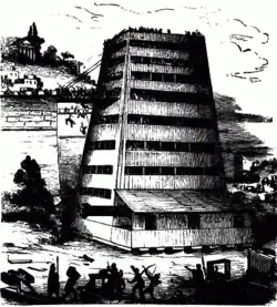 Według Plutarcha Demetriusz Poliorketes w trakcie oblężenia Rodos polecił Epimachosowi z Aten skonstruowanie machiny w postaci wieży o przekroju kwadratowym, kształtu ściętego ostrosłupa. Zbudowana z pni sosnowych i piniowych, części mechaniczne (koła, kołowroty i inne elementy napędowe) miała z drewna dębowego okutego spiżem lub żelazem. Na podstawie przekazów[3] wysokość jej oblicza się na 40–43 m przy boku o długości 20 m u podstawy, a ciężar na ok. 150 ton. Przesuwana na 4 rzędach kół (lub wałów tocznych) o wielkiej średnicy – nawet do 4,6 m, miała aż 9 kondygnacji z blankowaniem na szczycie. Każdy poziom wyposażono w dwie szerokie schodnie (do ruchu obustronnego) i na każdym znajdowały się katapulty i balisty o wielkości malejącej wraz z wysokością. Na najniższym rozmieszczano najcięższe katapulty do wyrzucania 80-kilogramowych kamieni, wyżej – miotające 27-kilogramowe pociski, a jeszcze wyżej – 14-kilogramowe. Najwyższe platformy przeznaczone były dla oszczepników i łuczników ostrzeliwujących obrońców. Przód wieży chroniony był metalowymi płytami zabezpieczającymi przed pociskami i ogniem, zaś otwory strzelnicze (ambrazury) zakrywane okiennicami poruszanymi linami. Obsługę stanowiło 200 ludzi, którzy przesuwali wieżę przy pomocy wewnętrznego kabestanu oraz 3200 innych, którzy ją pchali.
