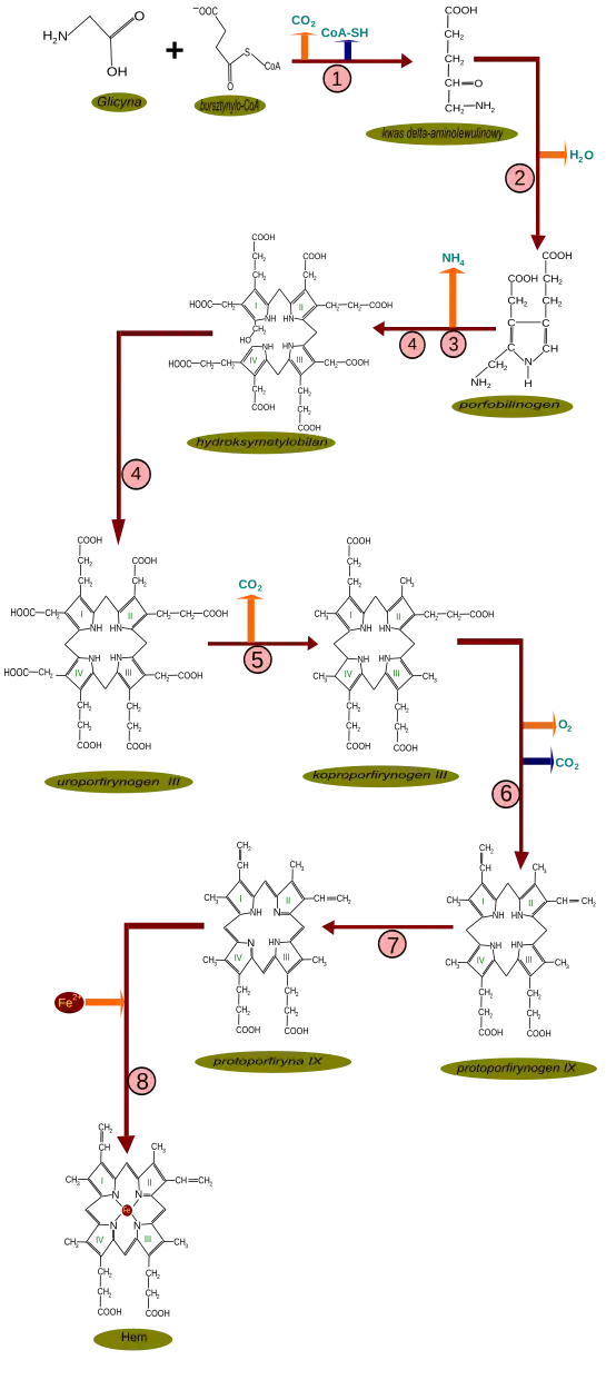 6 – oksydaza uroporfirynogenowa, 7 – oksydaza protoporfirynogenowa, 8 – ferrochelataza