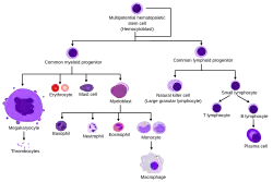 Następnie komórki macierzyste hemopoezy dzielą się, co kilka dni[3], niesymetrycznie dając: komórki macierzyste hemopoezy i komórki ukierunkowane (progenitorowa) różnego typu czyli[1]: